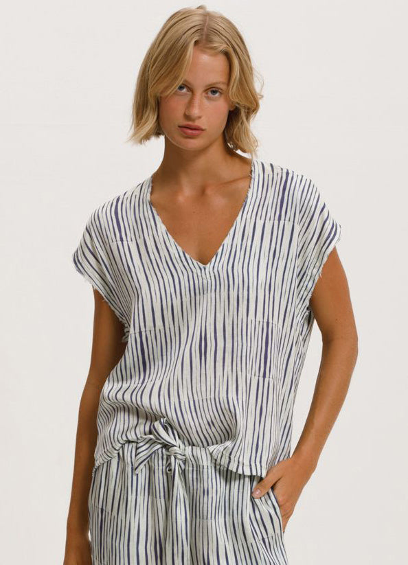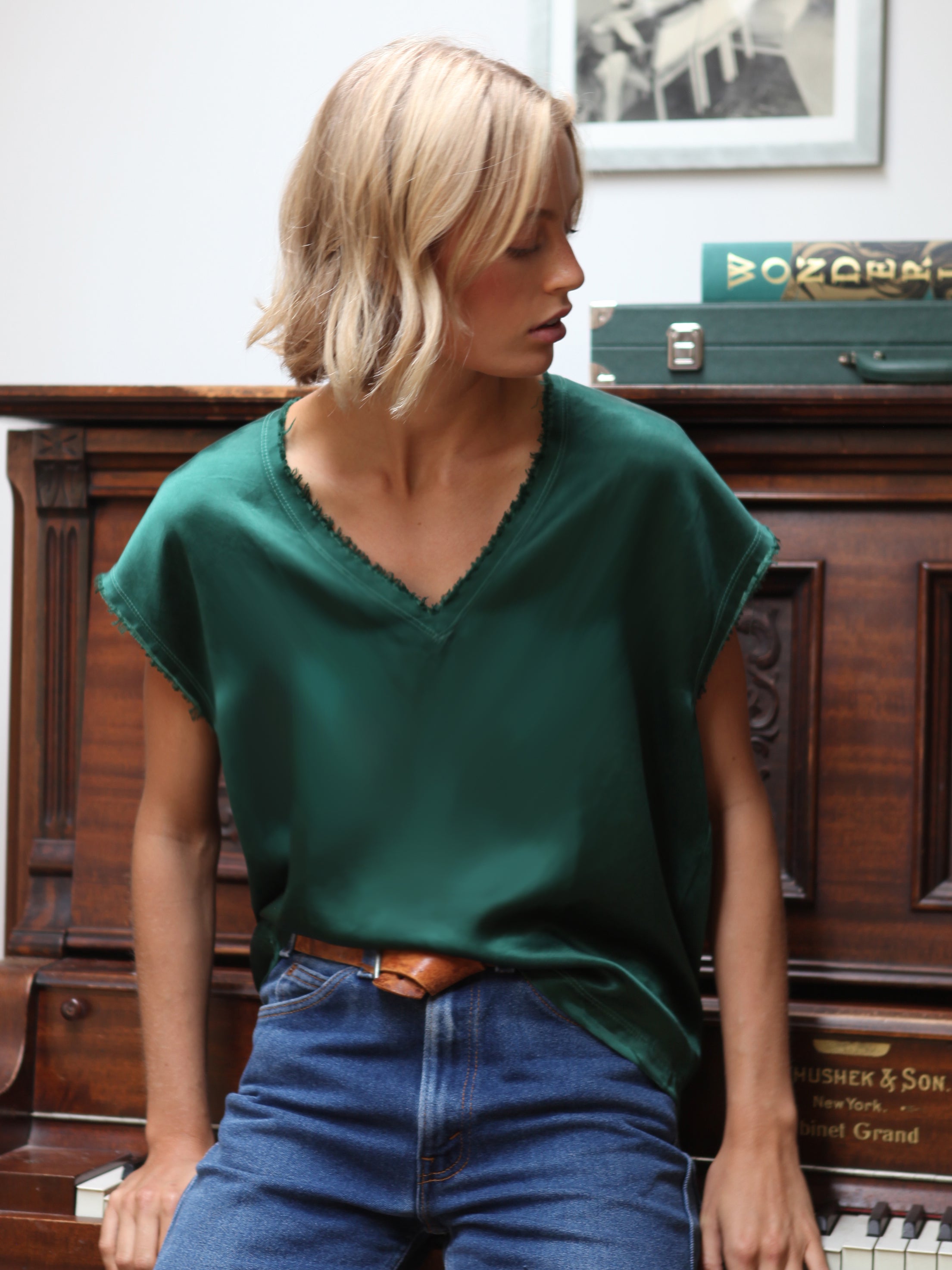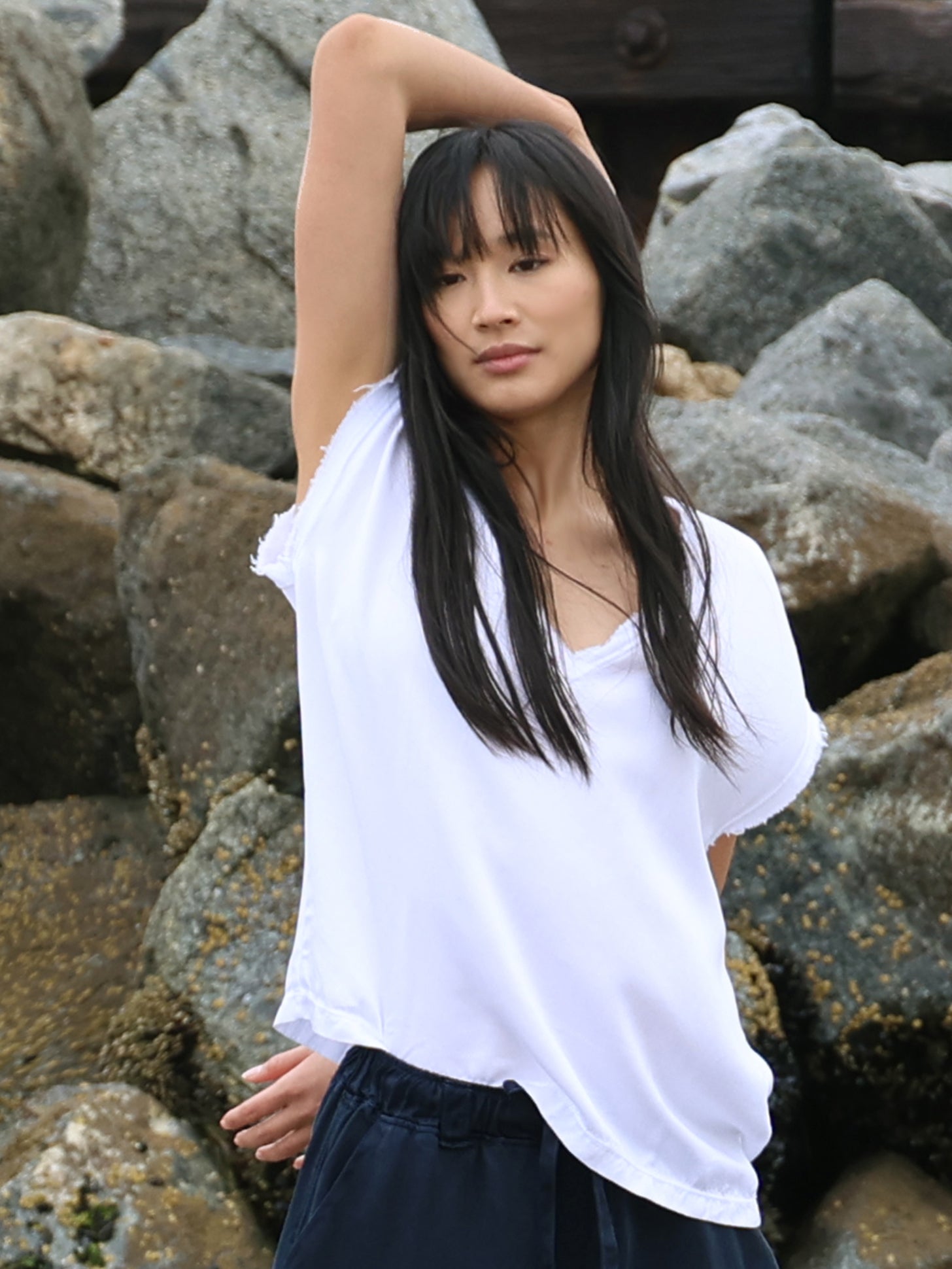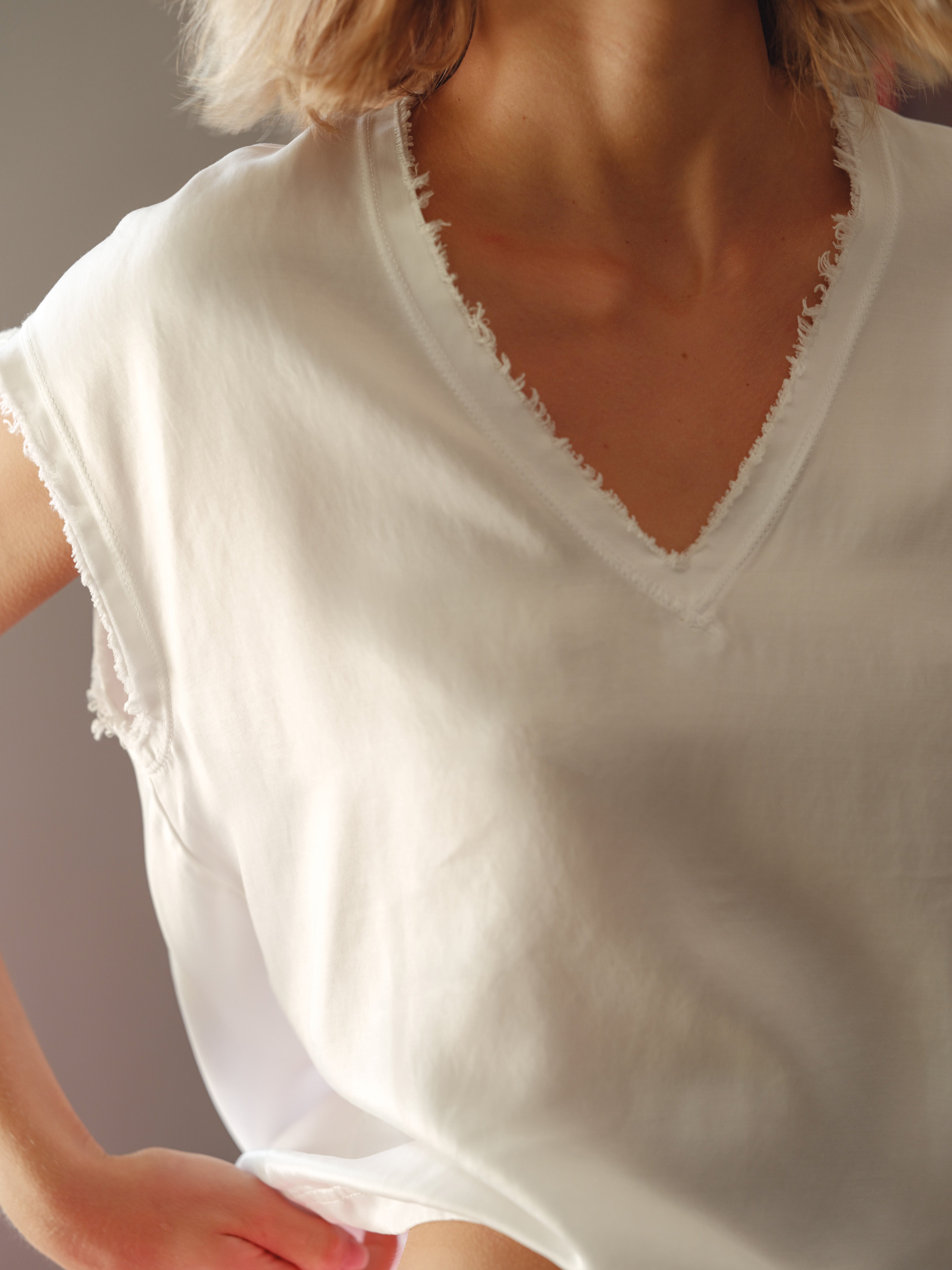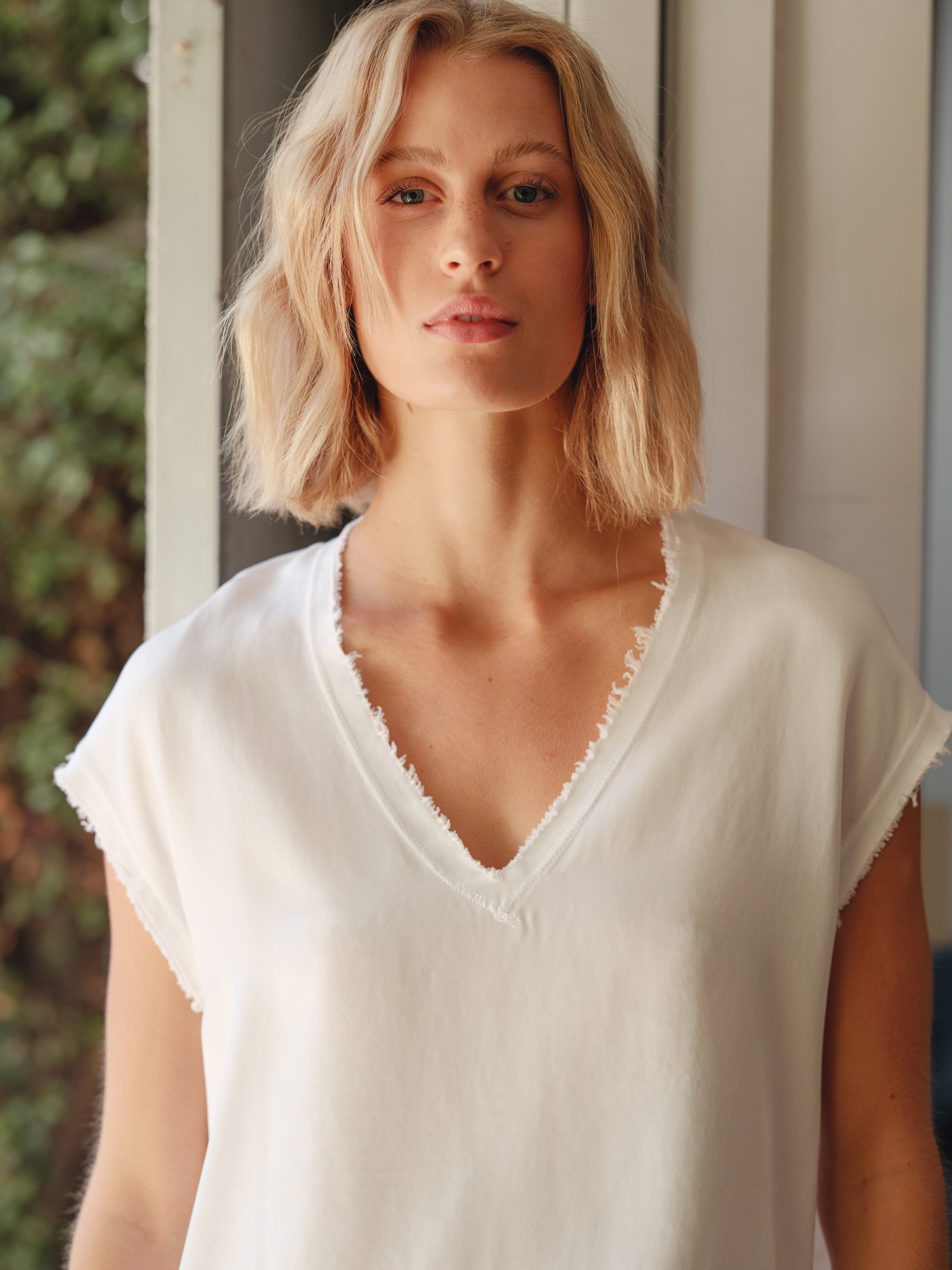 Our classic, soft v-neck, raw-edged tee. Fabricated in Cupro, an elegant and luxurious cotton blend fabric that allows the skin to breathe.