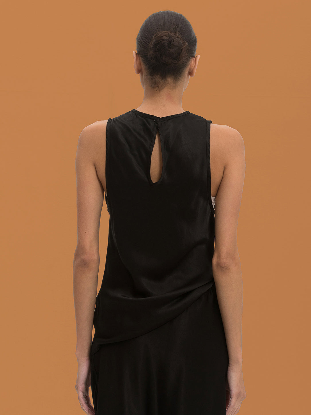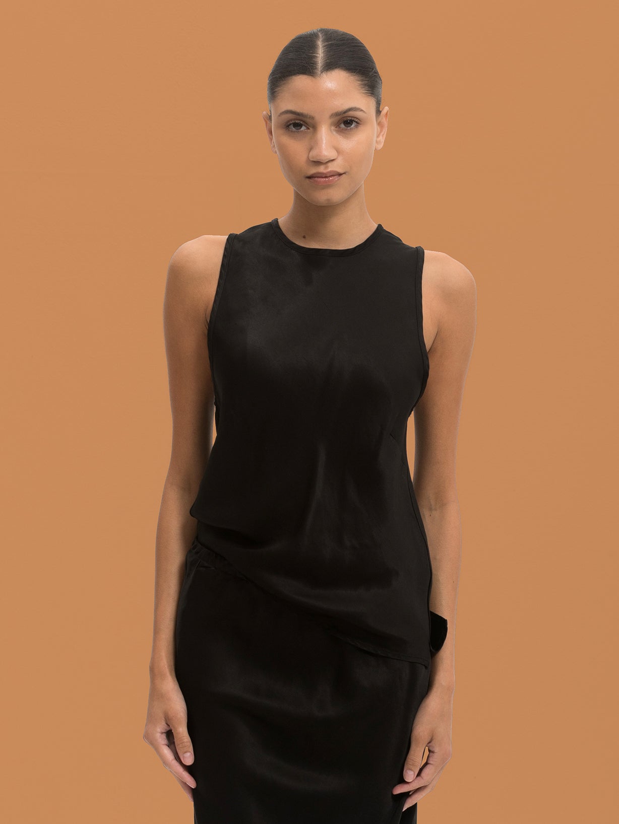The Lark Cami top has a high crew neck with a button clasp on the back, and the end of the blouse meets at your hip. She's sleek and very flattering, perfect for a date night, but can also be worn with shorts, denim, and skirts!