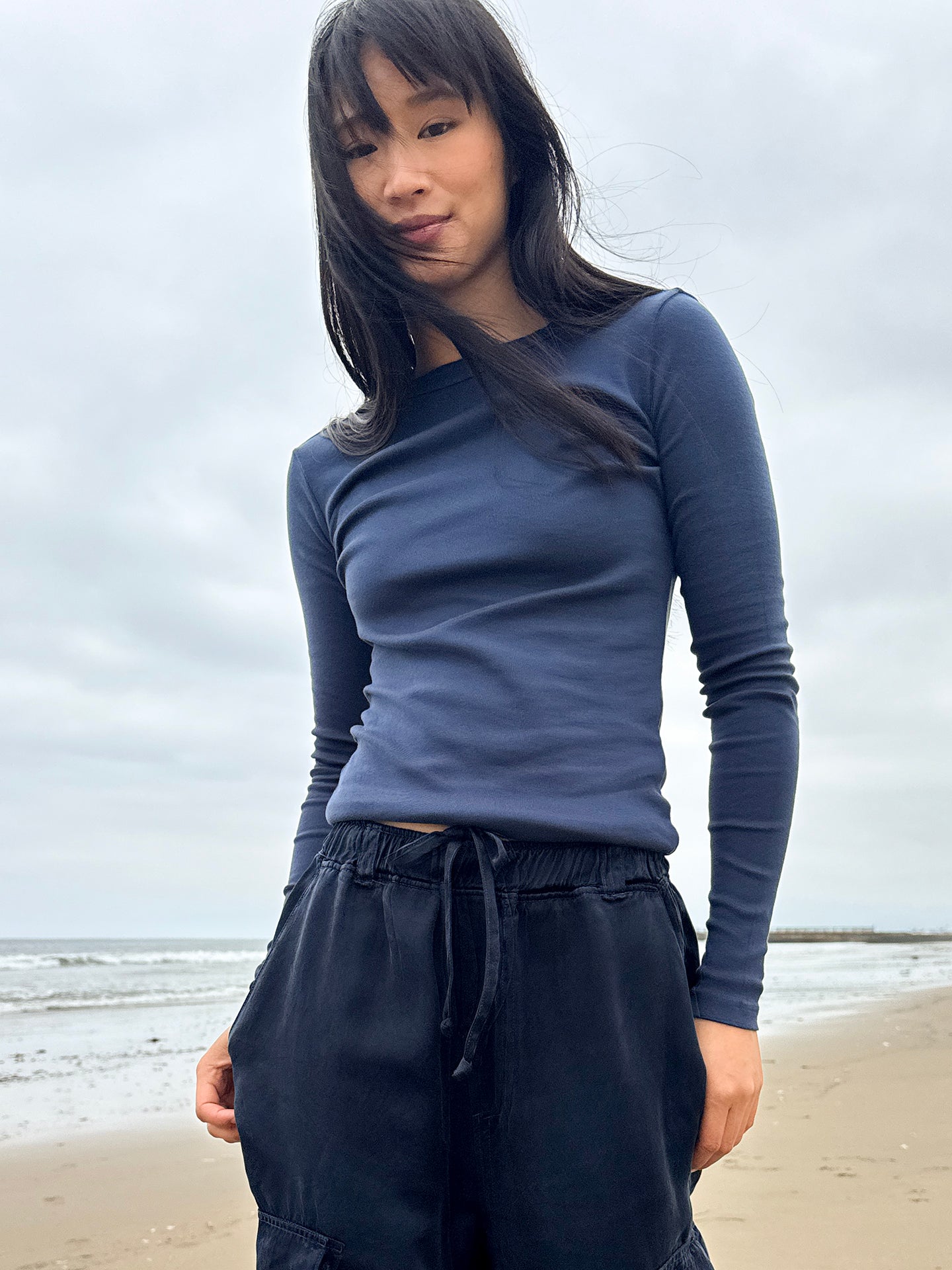 Our Cali Long Sleeve Crew Neck Tee is perfect for everyday-wear and/or layering. A fitted and slouchy long sleeve with a little extra length at the wrist that can be scrunched or rolled up.