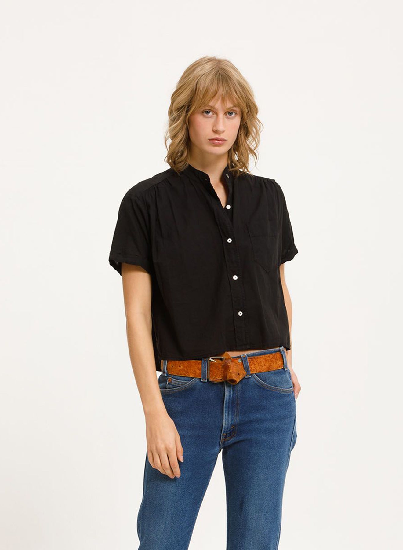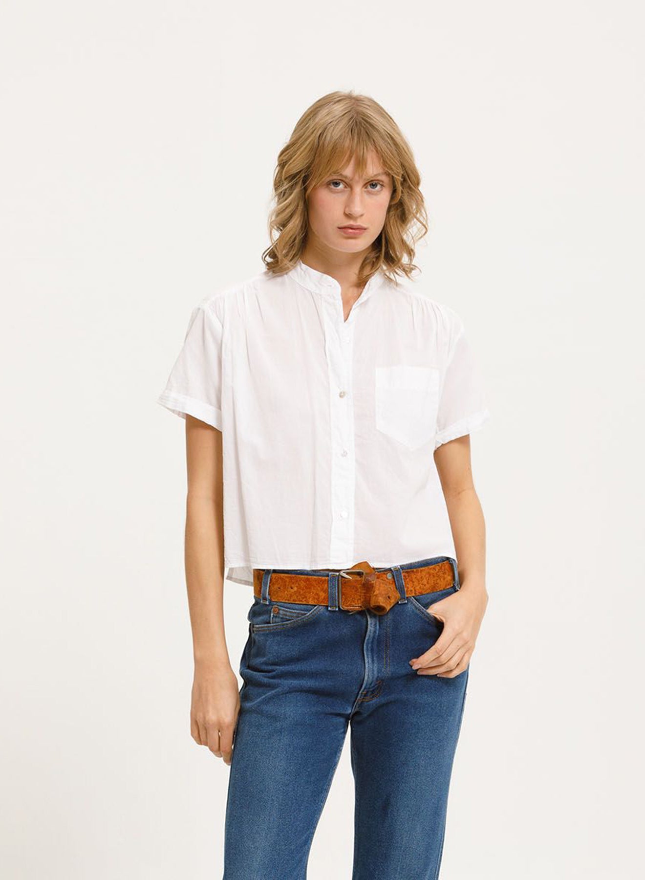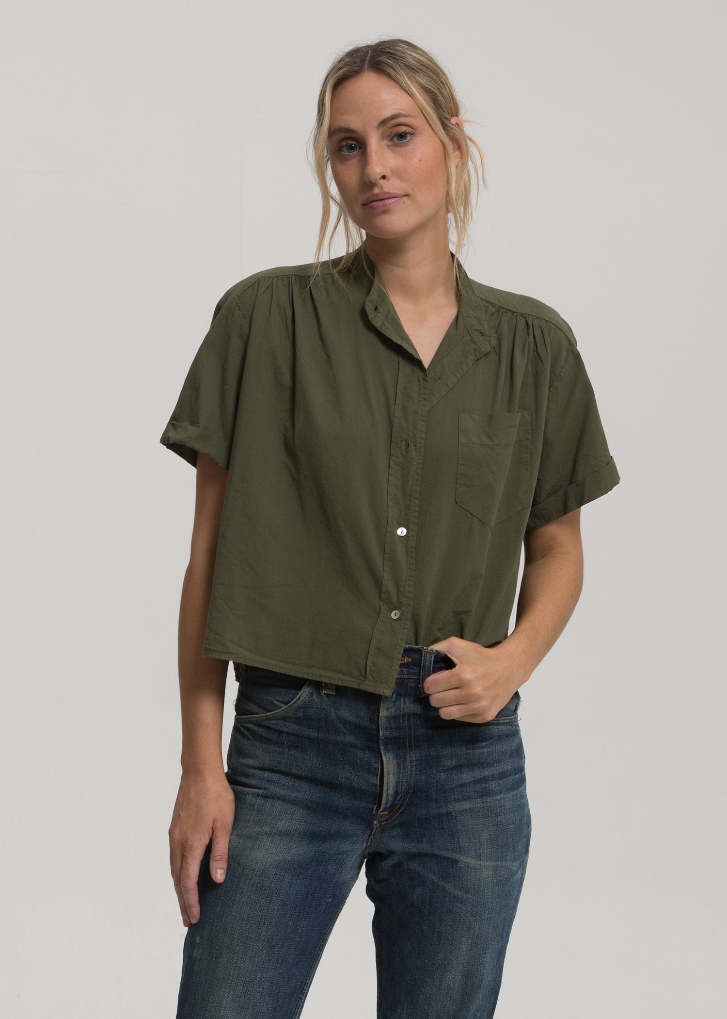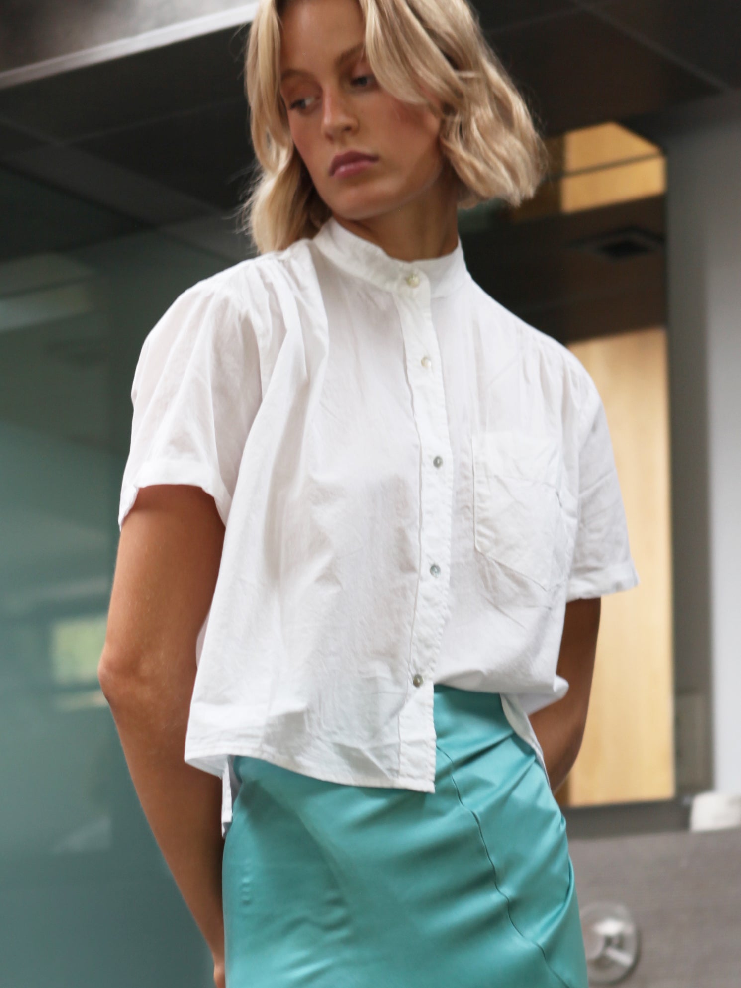 The Louella top features an easy rolled sleeve and button front. Collarless shirt, features a single front pocket, natural shell buttons and two ruching details at the shoulder give it a slight romantic flare.