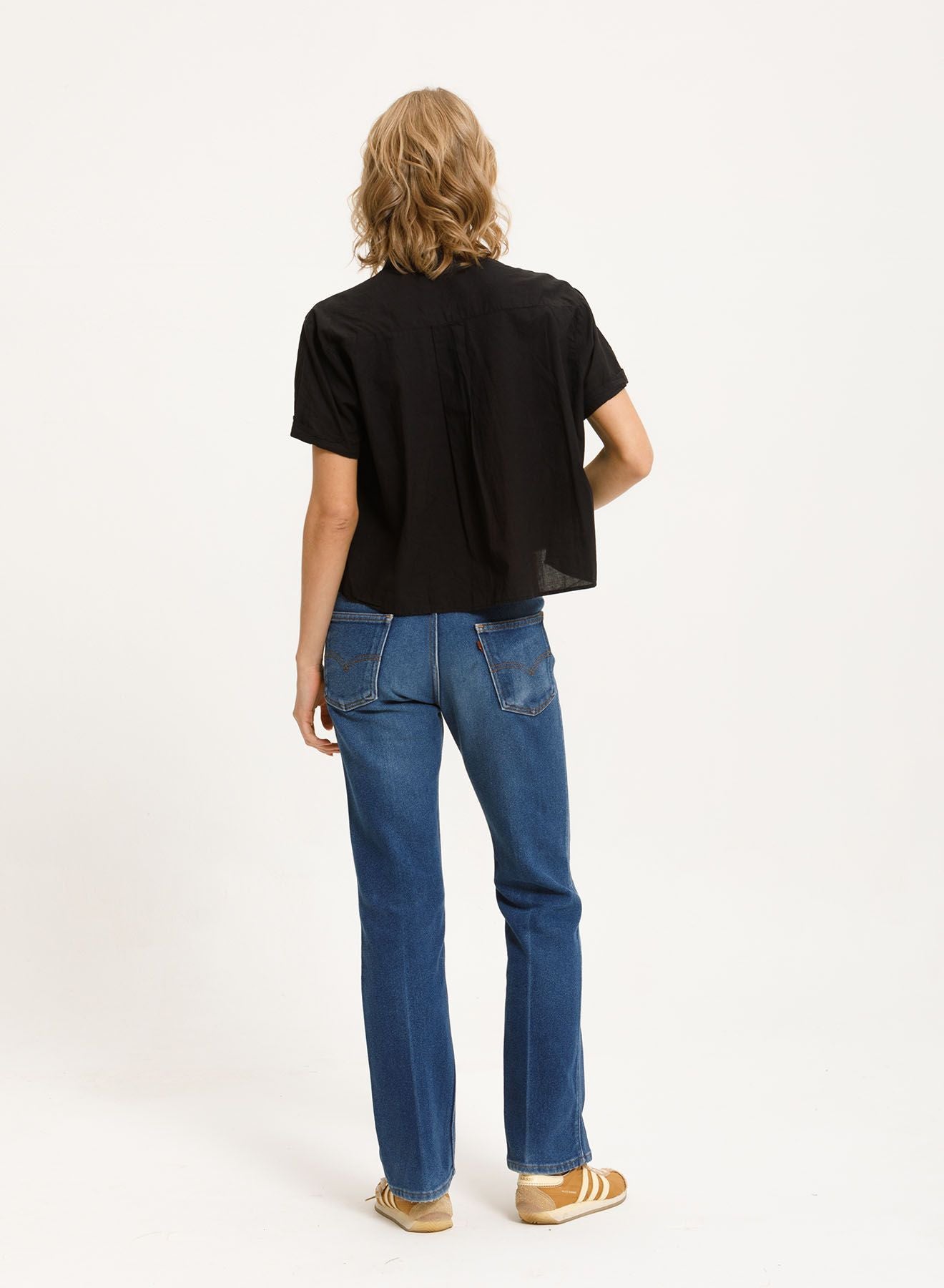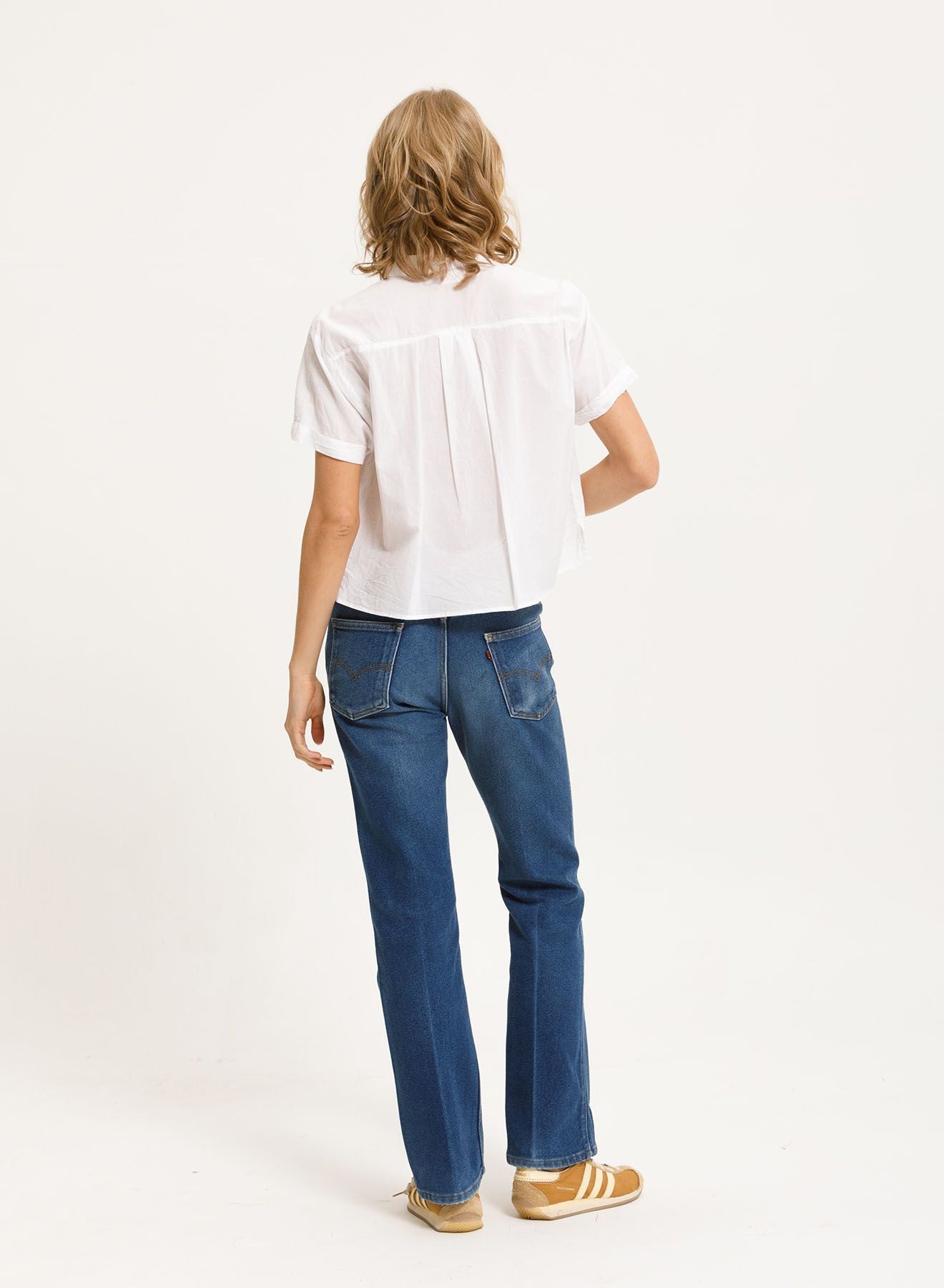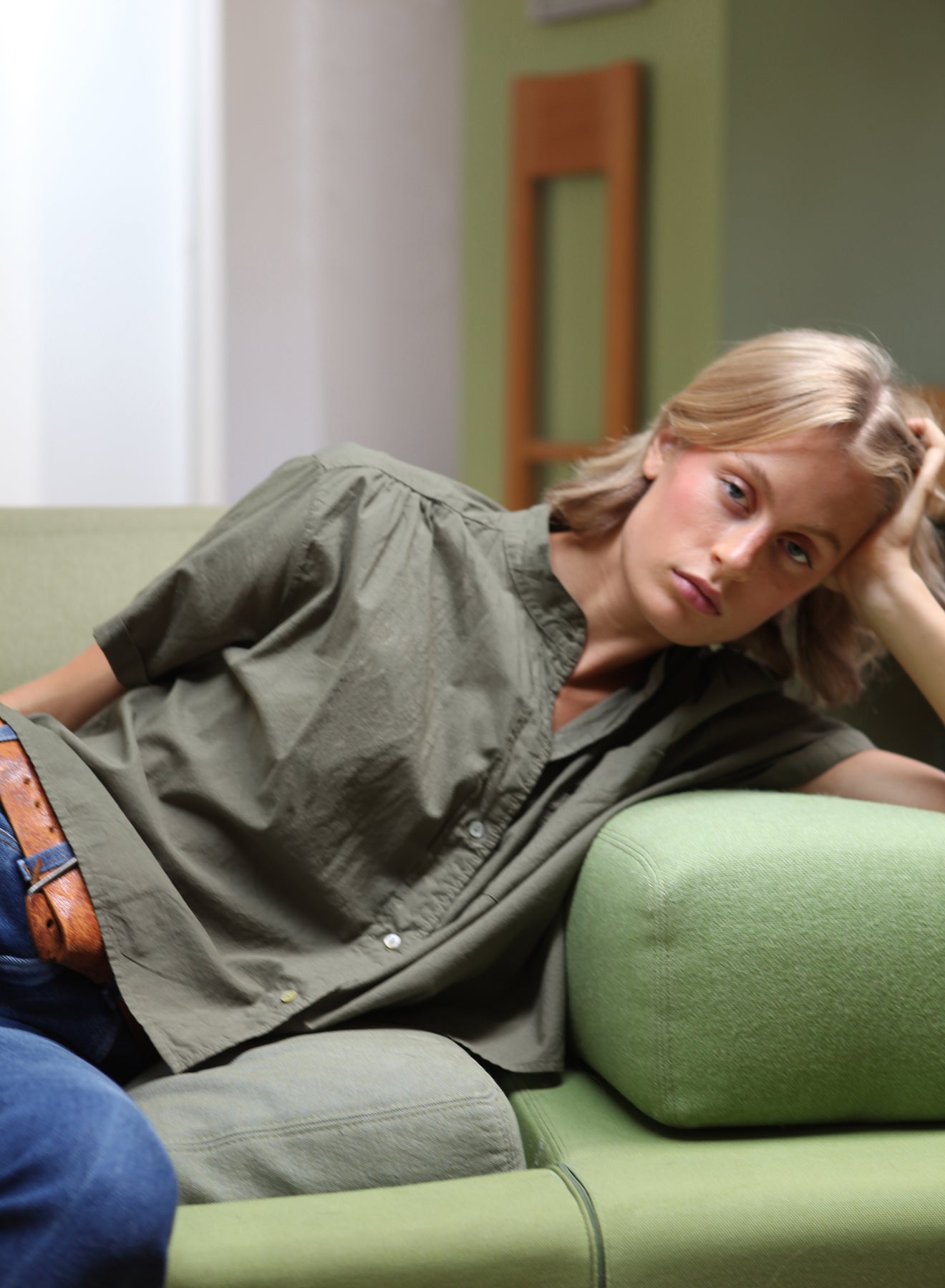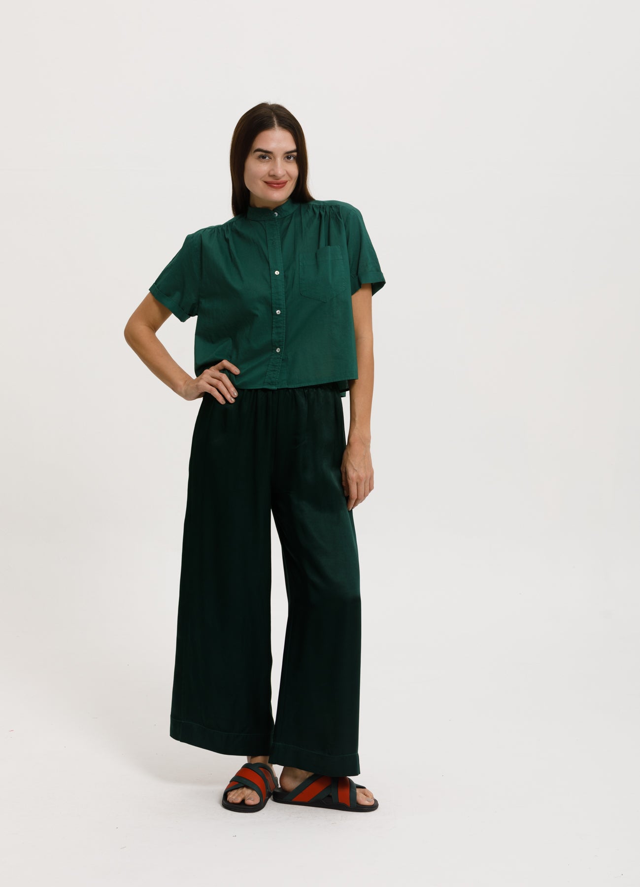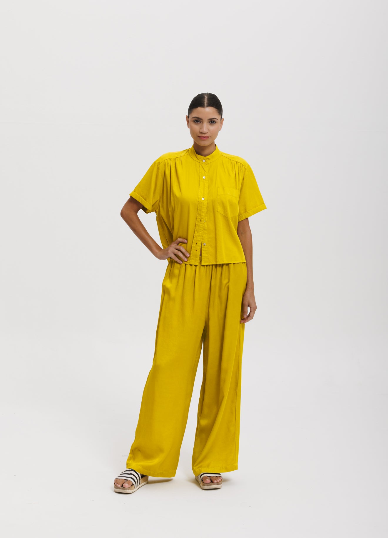 The Louella top features an easy rolled sleeve and button front. Collarless shirt, features a single front pocket, natural shell buttons and two ruching details at the shoulder give it a slight romantic flare.