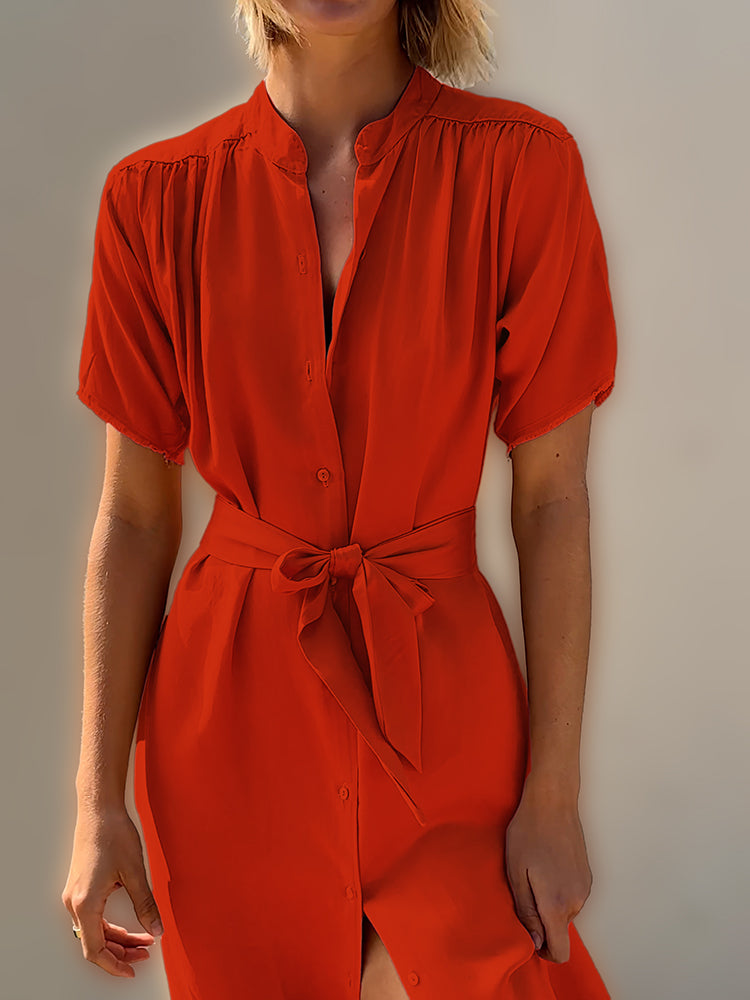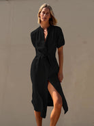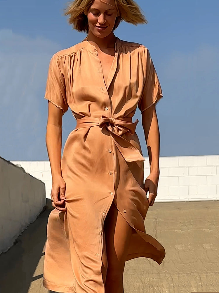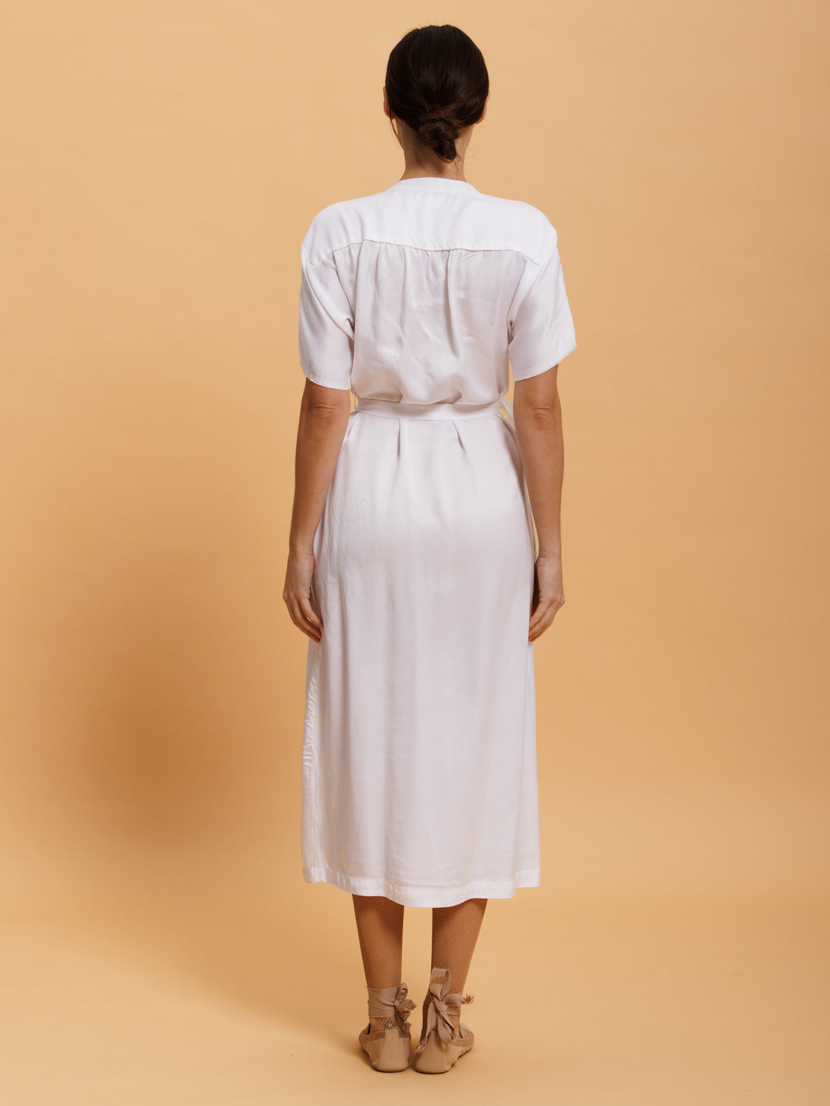 Classic elegance, day to evening, in this timeless midi dress. Short sleeved, side pockets, detailed ruching at shoulders & fabricated in Cupro (a luxurious cotton blend fabric that allows the skin to breathe) will add sophistication and comfort to your wardrobe.