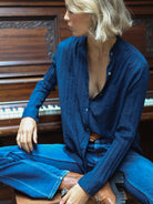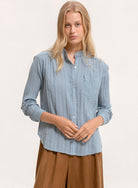 The ACE SHIRT is a classic that will never go out of style. A collarless shirt that features just the right amount of shirring at the collarbone, single front pocket and natural shell buttons.