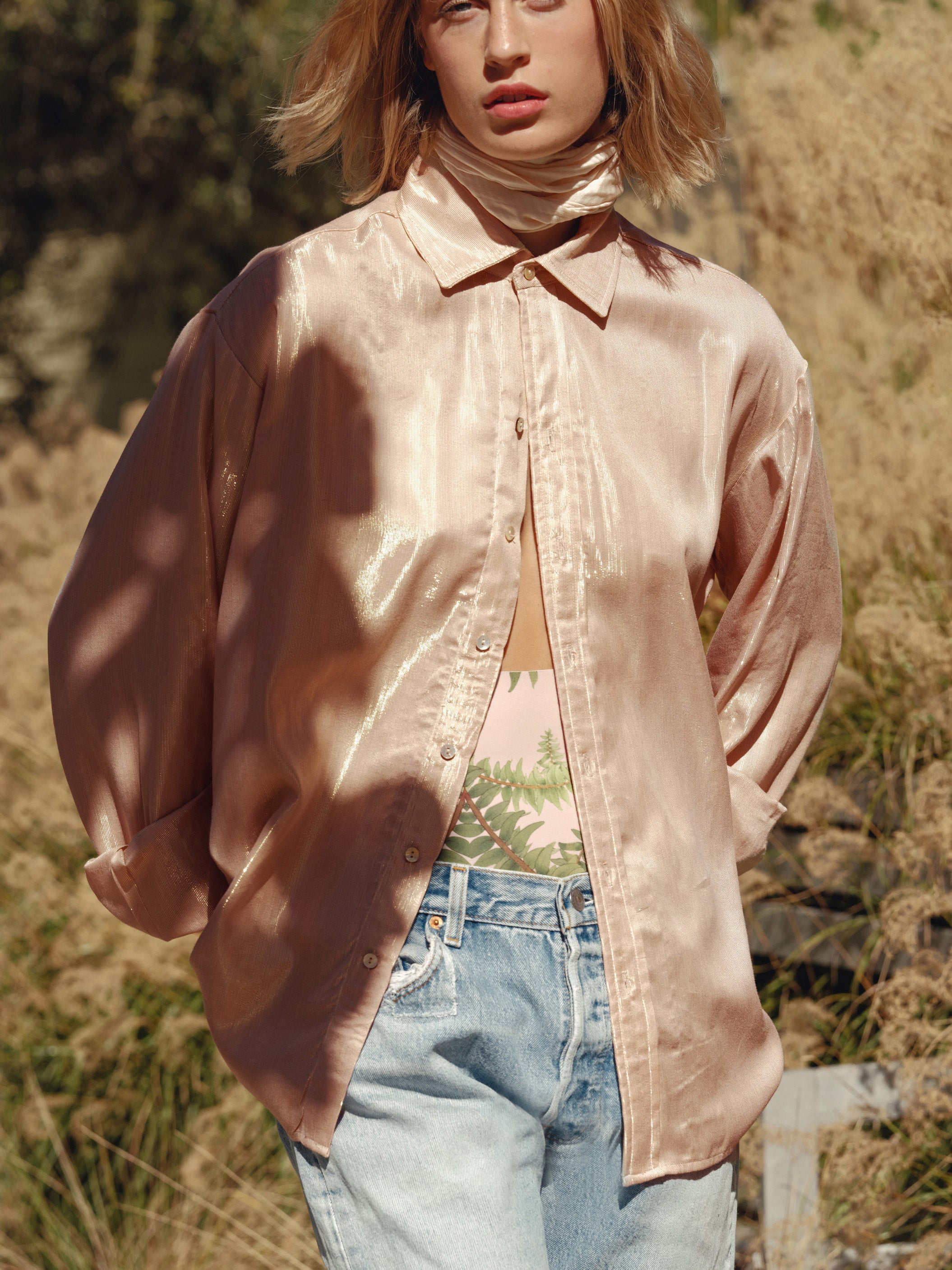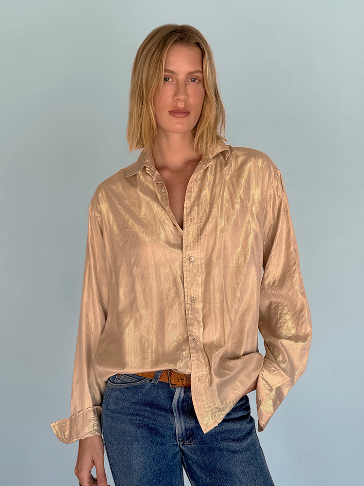 A sand colored shirt with a touch of glimmer, the natural shine from the gold weave elevates your everyday attire.