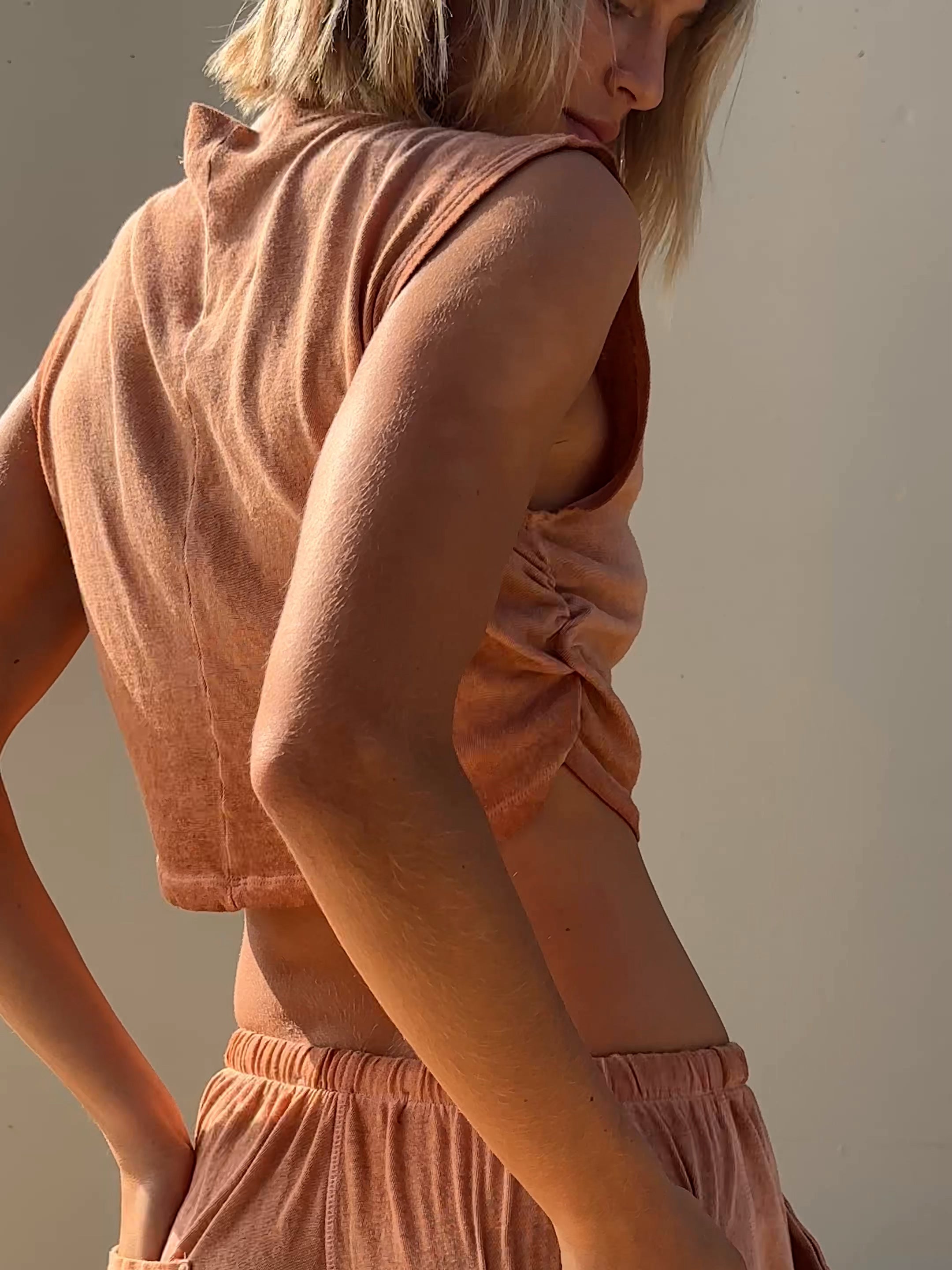 This sleeveless mock neck top with subtle ruching details, perfectly styles with any choice of bottom. Fabricated in our new, ultra soft 100% Organic Cotton Jersey, the Miro top feels like a second skin.