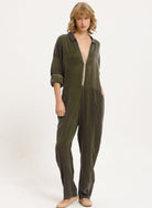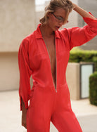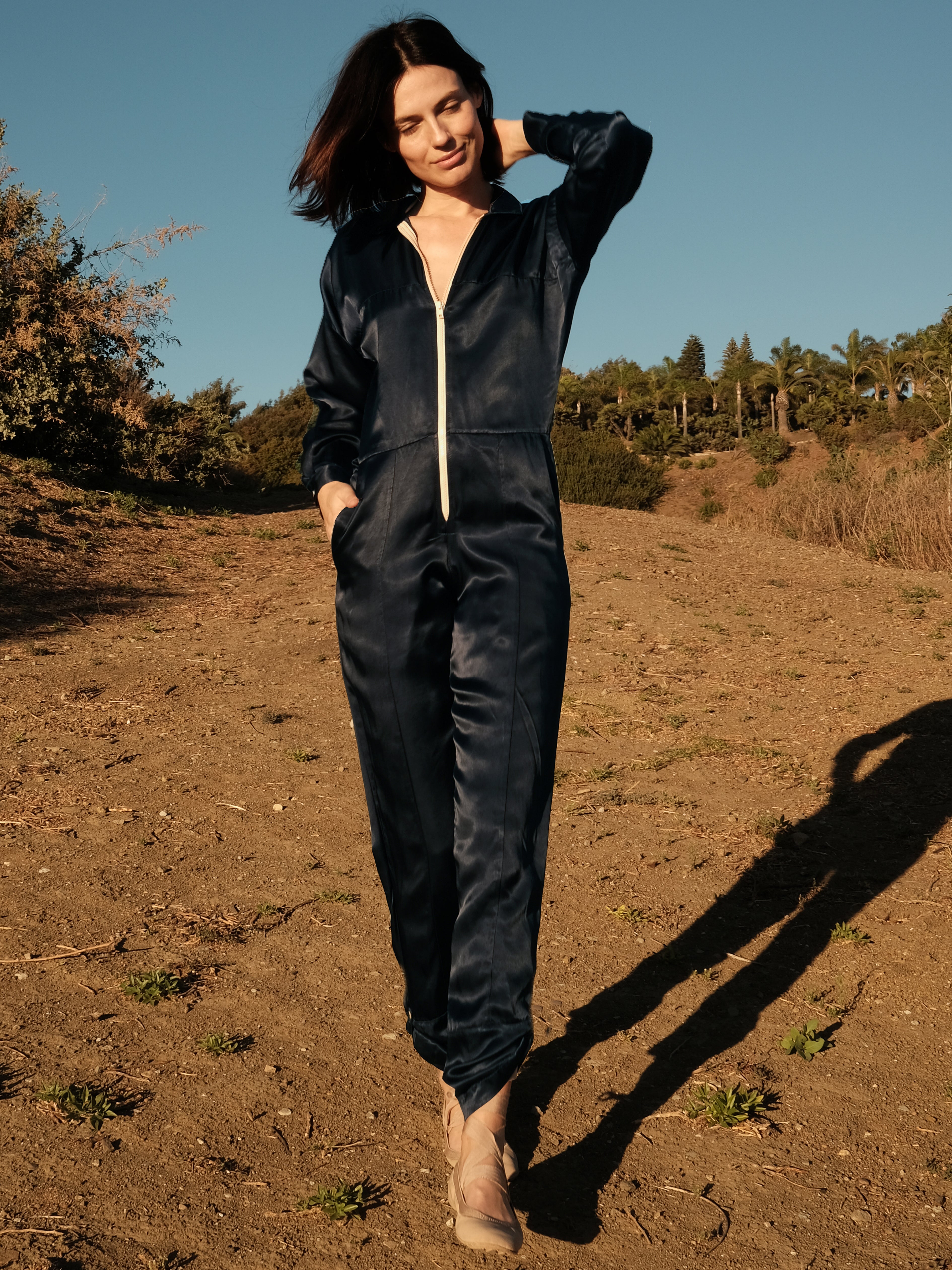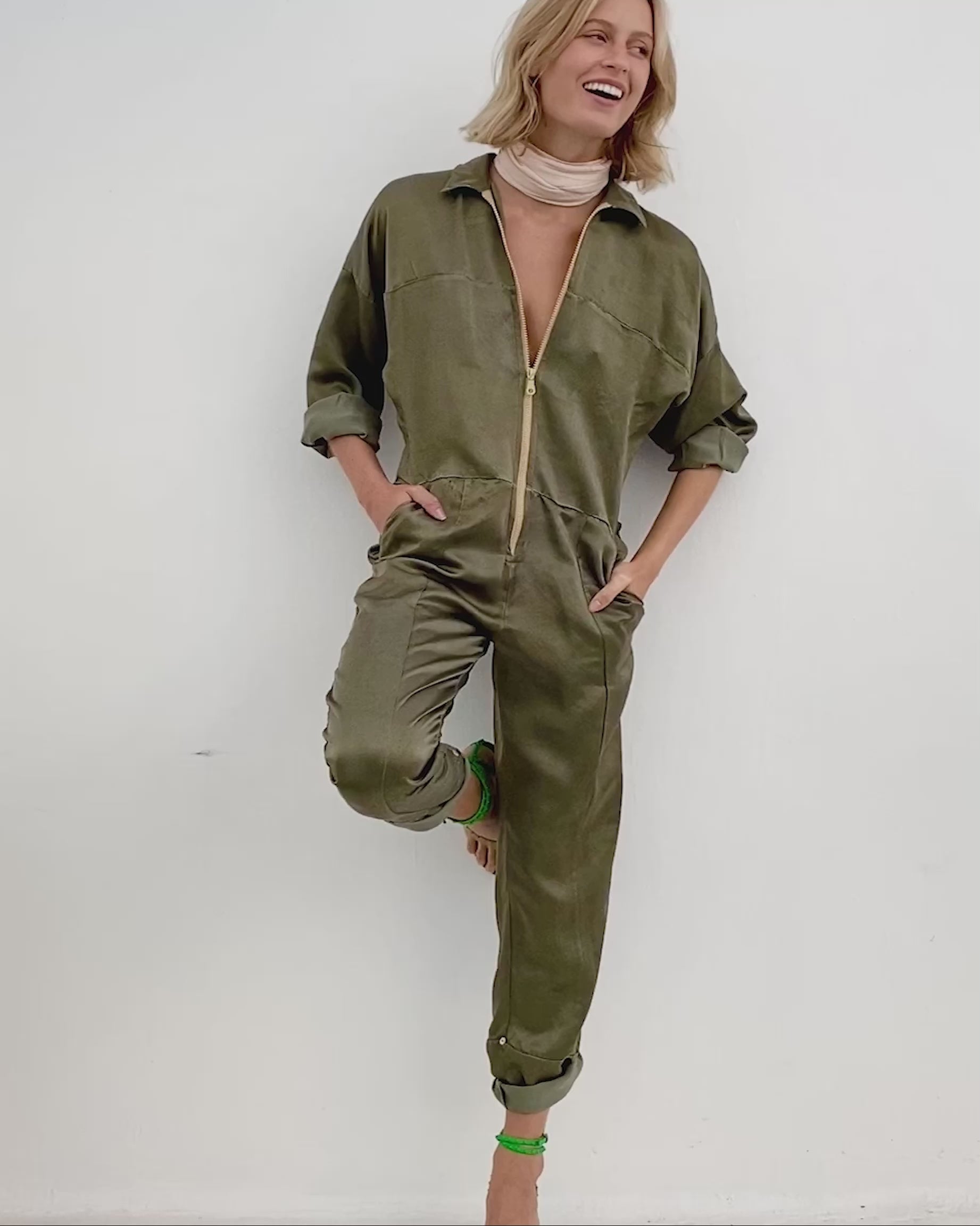 The FLIGHTSUIT is the coolest jumpsuit you will ever own. Our signature sand colored front zipper detail and button-up option at the ankle adds versatility however you wish to wear it. Size down for a slim, sexy fit or size up for a more casual, relaxed look. Our model (5'10") wears a small for the slim fit and a large for the relaxed fit.